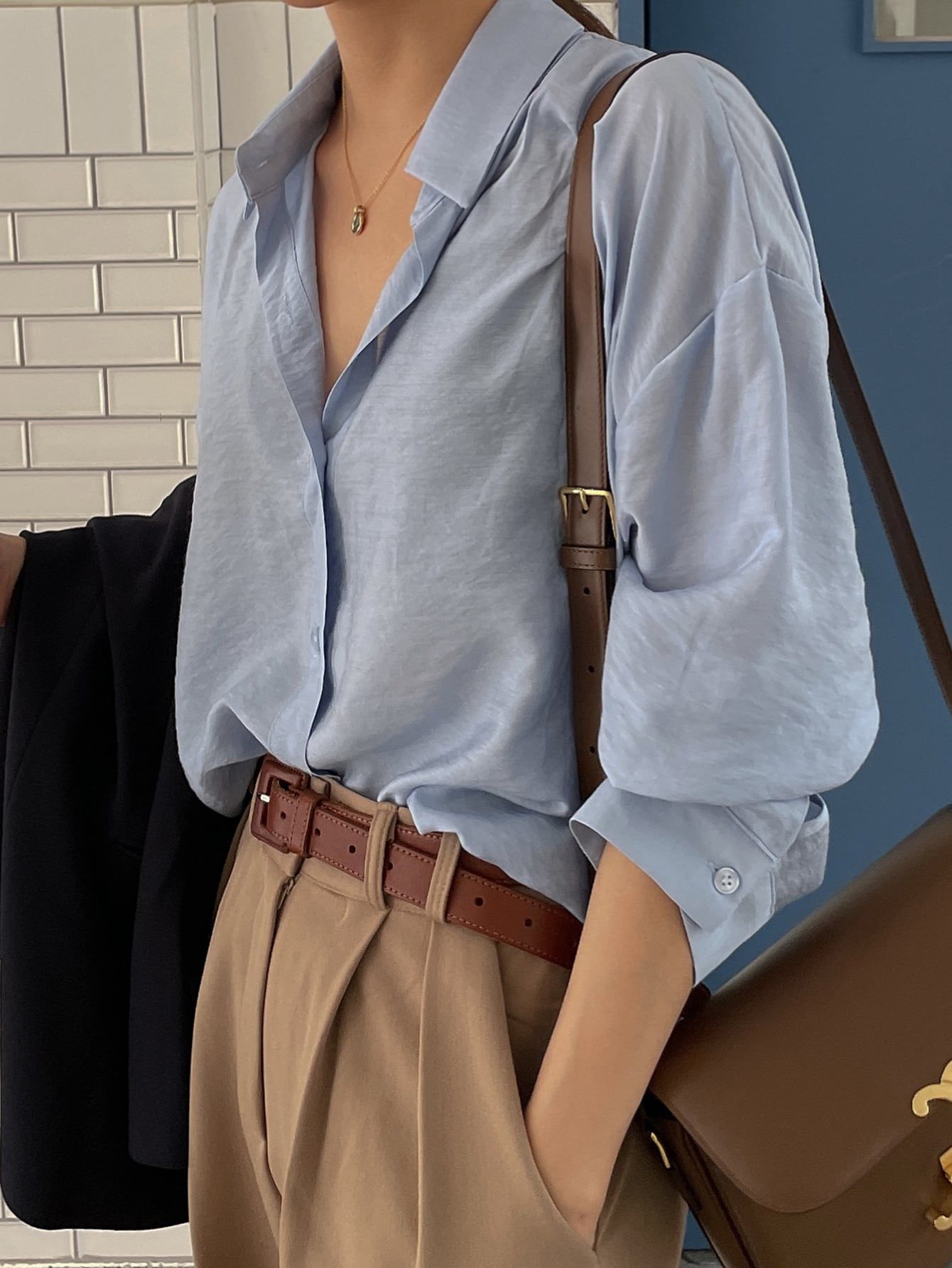 중성미있는 핀턱 팬츠와 라이트블루 셔츠가 정말 잘 어울림