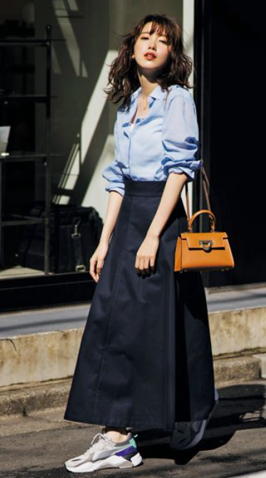 셔츠와 롱스커트로 무게는 잡아주되 스니커즈로 young한 느낌도 살려주기